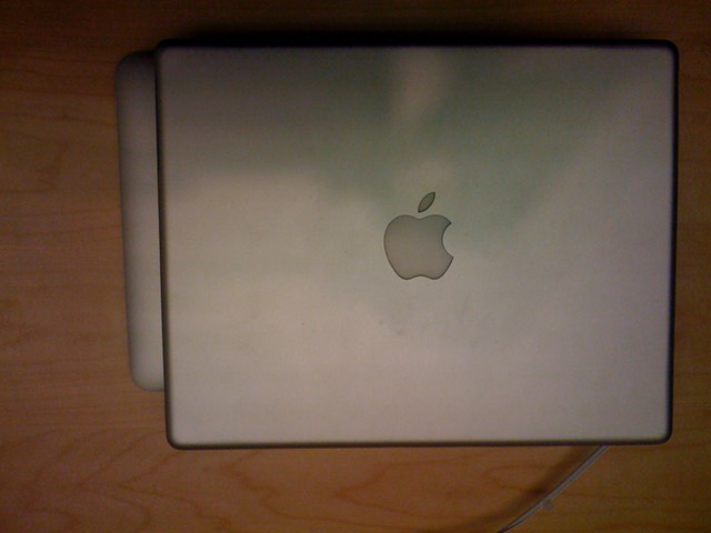 This time the Powerbook rests on the Macbook Air. The extra width of the Macbook Air is visible.