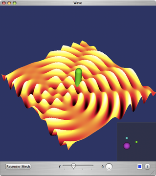 In a nutshell, the program demonstrates how to use an OpenGL Vertex Shader to move all the vertices in mesh. Since executing a shader is massively parallel on a video card that supports it, this is a really fast operation. The program also uses a Fragment Shader to color the mesh so you can see it more carefully. The code uses OpenSceneGraph which can be described as a wrapper around OpenGL. I leverage the osgviewerCocoa class that I wrote for an OpenSceneGraph example. It is a subclass of NSOpenGLView that integrates OSG functionality with Cocoa. And for kicks, I also utilize OpenAL for a sound 'visualization'.